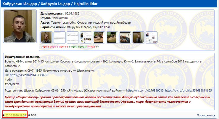 Висновок експертизи з портретизації підтвердив, що людина у військовій формі і зі зброєю на світлині у профілі "Миротворця" справді є Ільдар Хайрулін. Зазначається, що окупант публікував пости в мережі про військові дії в Україні.