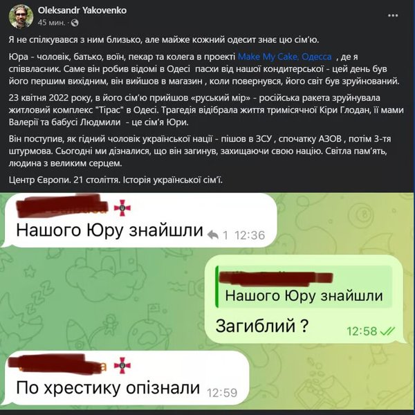 "Я не спілкувався з ним близько, але майже кожний одесит знає цю сім’ю. Юра — чоловік, батько, воїн, пекар та колега в проєкті Make My Cake, Одесса, де я співвласник. Саме він робив відомі в Одесі пасхи від нашої кондитерської — цей день був його першим вихідним, він вийшов в магазин, коли повернувся, його світ був зруйнований", — написав чоловік.