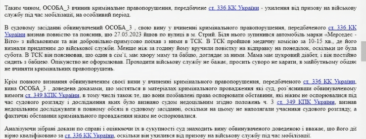 ВажливоВ суді обвинувачений свою вину у вчиненні кримінального правопорушення визнав повністю. Він пояснив, що наприкінці травня, у суботу, йшов вулицею в місті Стрий. Біля нього зупинився автомобіль марки "Мерседес — Віто" з військовими і він добровільно-примусово поїхав з ними в ТЦК, де пройшов медичну комісію за 10-15 хвилин, і його визнали придатним до військової служби. Менше ніж за годину, за словами чоловіка, йому вручили повістку на відправку на понеділок. Обвинувачений в військкоматі заявив, що один в сім`ї, має хвору маму та бабцю і доглядає за ними. Його мати нібито має цукровий діабет, і він постійно сидить з бабцею. Опікунство не оформлював. Проходити військову службу не бажає, просить суворо не карати, в майбутньому обіцяє не вчиняти кримінальних правопорушень.