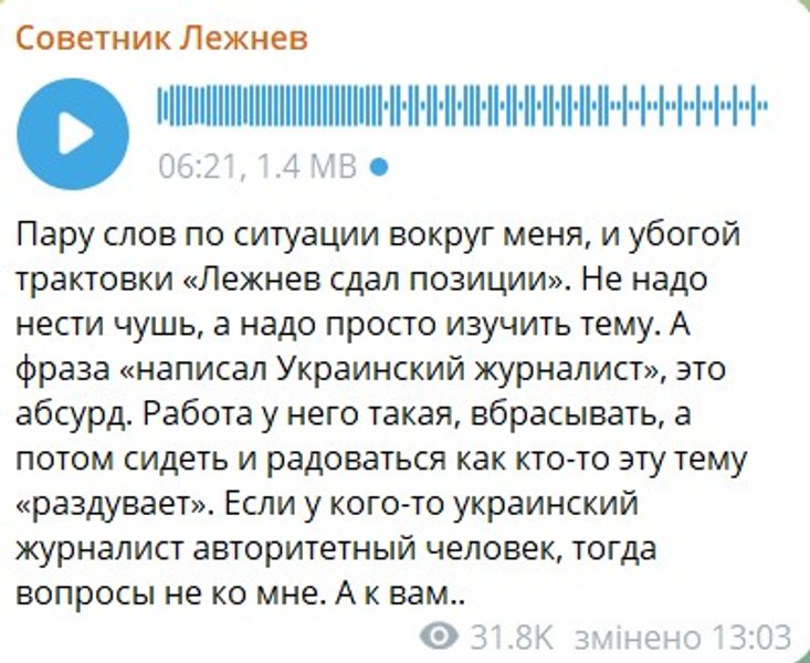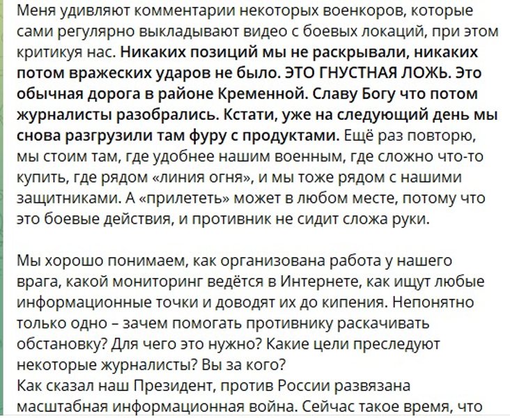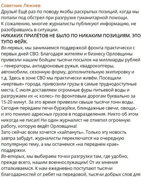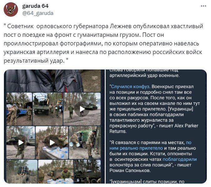 ВажливоУ дописі детально описано перебіг подій, завдяки якому відбувся артилерійський удар по місцю, де проходила колона російських вантажівок. Вказується, що 14 листопада Сергій Лежнєв опублікував кадри з заправки, розташованій у Луганській області неподалік від окупованого міста Кремінна. При цьому у кадр потрапили характерні ознаки, за якими була можливість ідентифікувати місцевість.