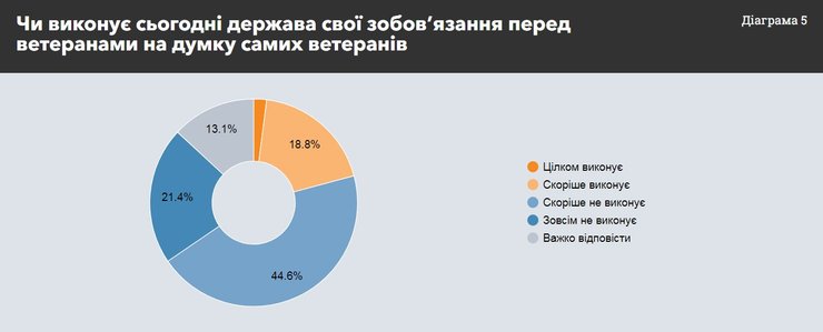 Показник ветеранів, які вважають, що держава зовсім не виконує своїх зобов’язань перед ними зріс удвічі (жовтень – 21,4%, проти 8,3% у лютому 2023 року). Натомість 18,8% опитаних вважає, що швидше все ж виконує.