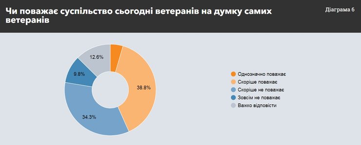 Загалом 44,1% ветеранів переконані у відсутності поваги до них (це сумарні відповіді по категоріях "зовсім не поважає" + "скоріше не поважає"). У лютому таких було 25,4 %.