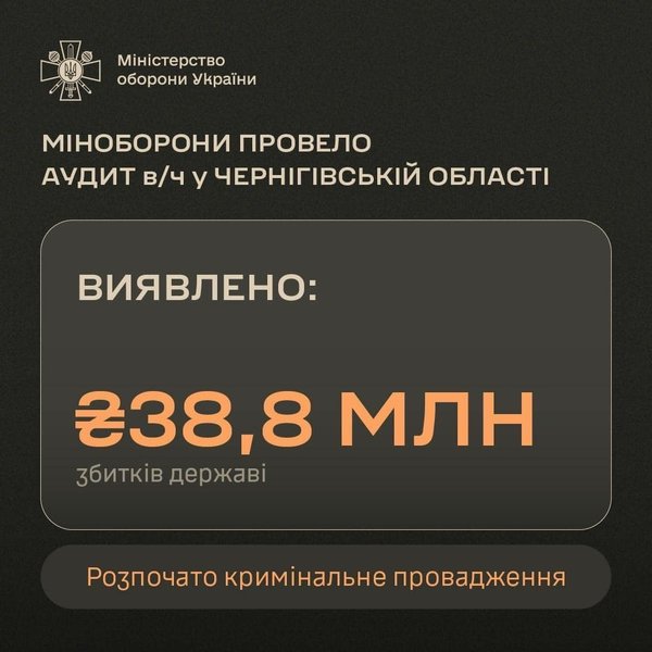 Зазначається, що служба внутрішнього аудиту Міноборони разом з правоохоронцями перевірили військову частину і виявили порушення, що призвели до збитків державі на суму 38,8 млн грн.