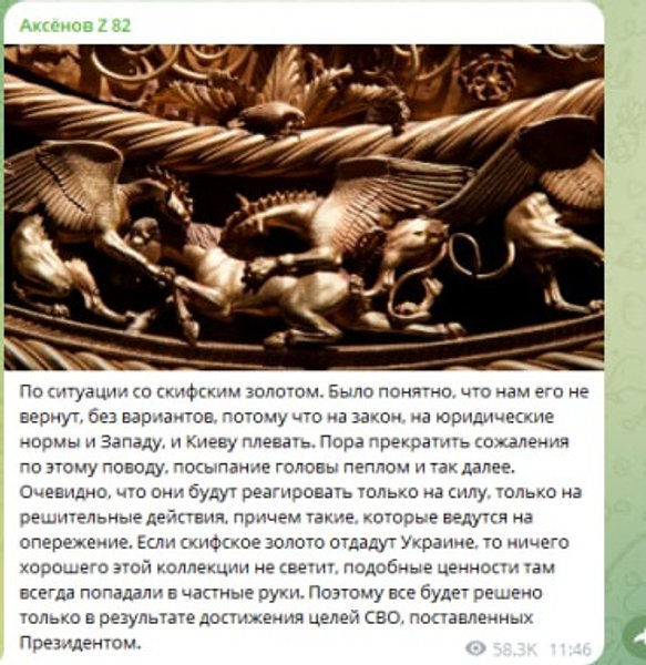 "Щодо ситуації зі Скіфським золотом. Було зрозуміло, що нам його не повернуть, без варіантів, бо на закон, на юридичні норми і Заходу, і Києву начхати. Настав час припинити жаль стосовно цього, посипання голови попелом і так далі. Очевидно, що вони реагуватимуть лише на силу, лише на рішучі дії, причому такі, які ведуться на випередження", — написав він.
