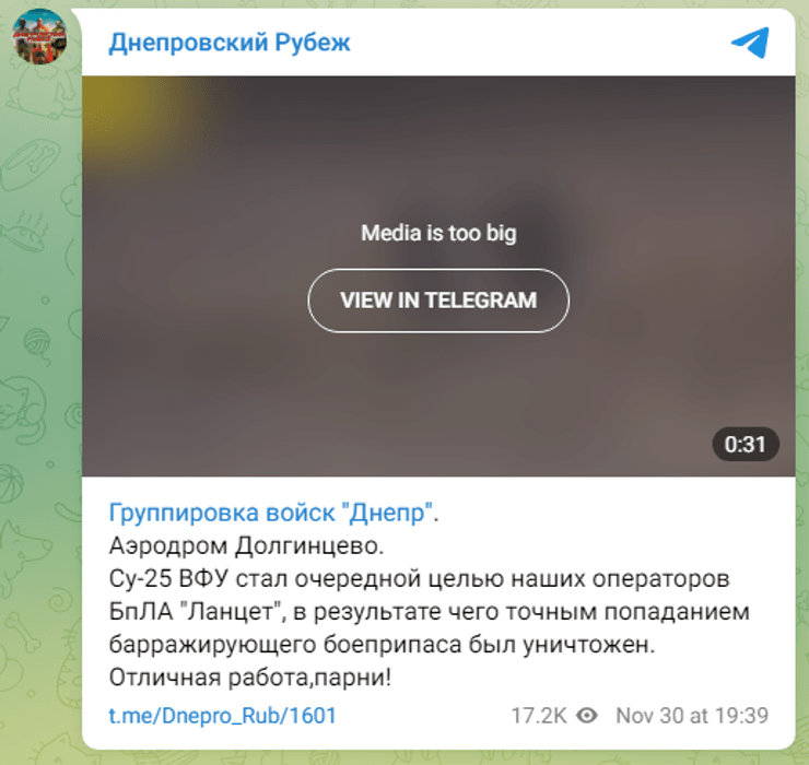 Російські пабліки публікують відео, на якому нібито зафіксовано момент ураження українського літака дроном "Ланцет". Відповідне відео 30 листопада опублікував російський Telegrma-канал "Днепровский рубеж".