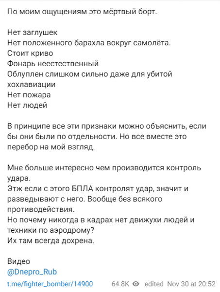 "За моїми відчуттями це мертвий борт. Немає заглушок. Немає належного барахла навколо літака. Стоїть криво. Ліхтар неприродний. Облуплений занадто сильно навіть для вбитої х**авіації. Немає пожежі. Немає людей", — зазначив Туманов.