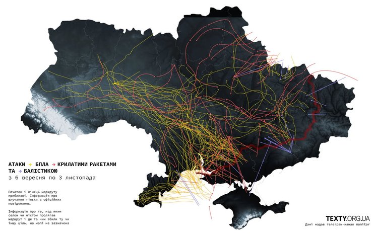 На карту наклали всі приблизні маршрути ворожих повітряних атак, які тривали від 6 вересня по 3 листопада цього року. На них помітно одну річ: більшість БпЛА летить із Криму.