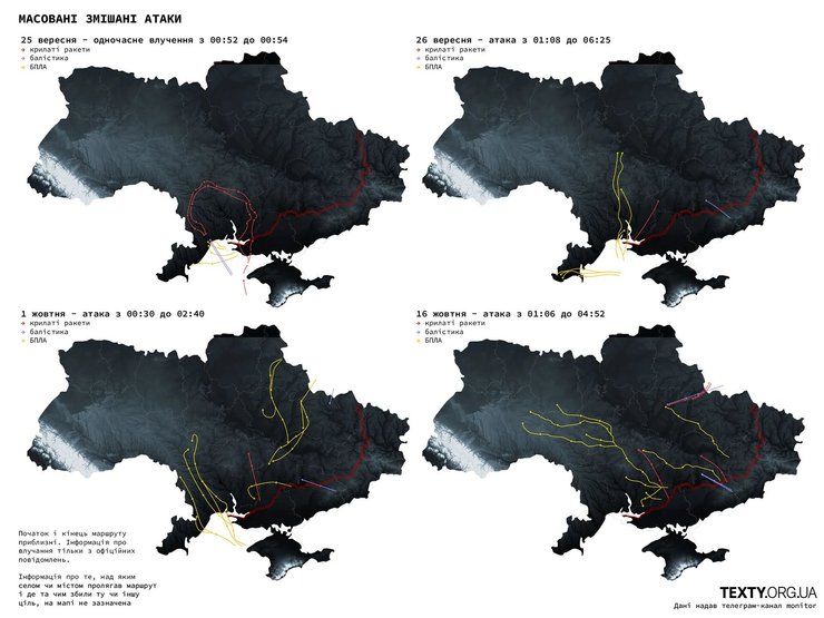 У Повітряних силах повідомляли, що ворожі "шахеди" часто атакують за руслами річок, дорогами та межами областей. Над річкою можна летіти низько та непомітно для радарів ППО, і над дорогою шум ударних дронів зливається з шумом автомобілів. Українське аналітичне видання texty опублікувало карти з маршрутами російських БПЛА та ракет, якими завдають ударів по Україні.