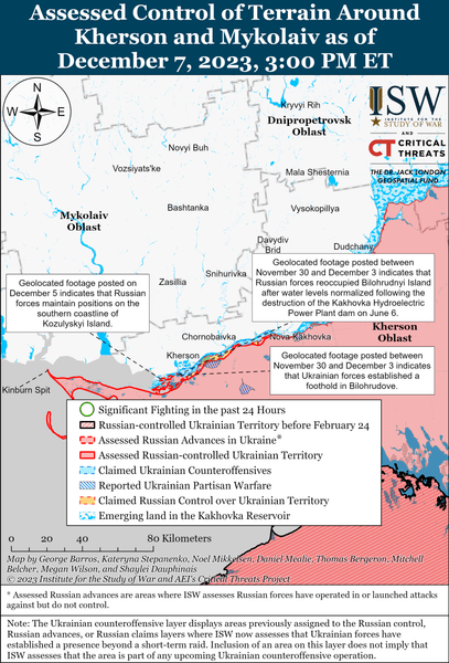Сили оборони висадилися на Кінбурнській косі, а окупанти просуваються під Авдіївкою і Бахмутом. Про це свідчать дані американського Інституту вивчення війни за 7 грудня.