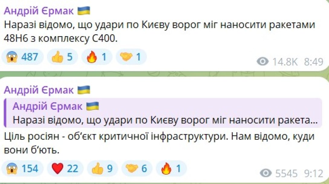 ВажливоАндрій Єрмак стверджує, що для удару по Києву росіяни застосували ракети 48Н6, випущені з пускової установки С-400. Також повідомив, що ворог цілився у об'єкт критичної інфраструктури.