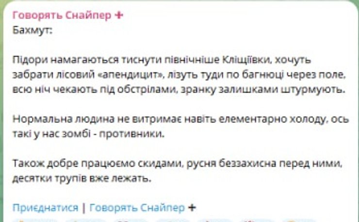 "Окупанти намагаються тиснути північніше Кліщіївки, хочуть забрати лісовий "апендицит", лізуть туди по багнюці через поле, всю ніч чекають під обстрілами, зранку залишками штурмують", — проінформував він.