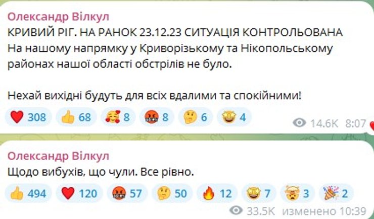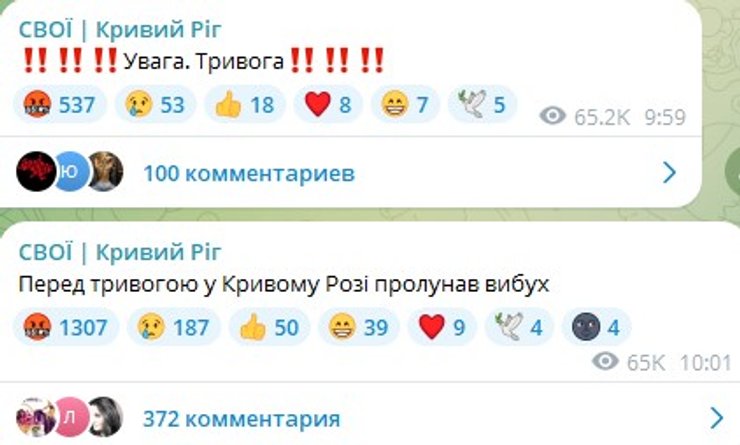 Приблизно в такий самий час звуки вибухів нібито було чути й у Кривому Розі. Причому місцеві канали стверджують, що вибухи пролунали перед повітряною тривогою.