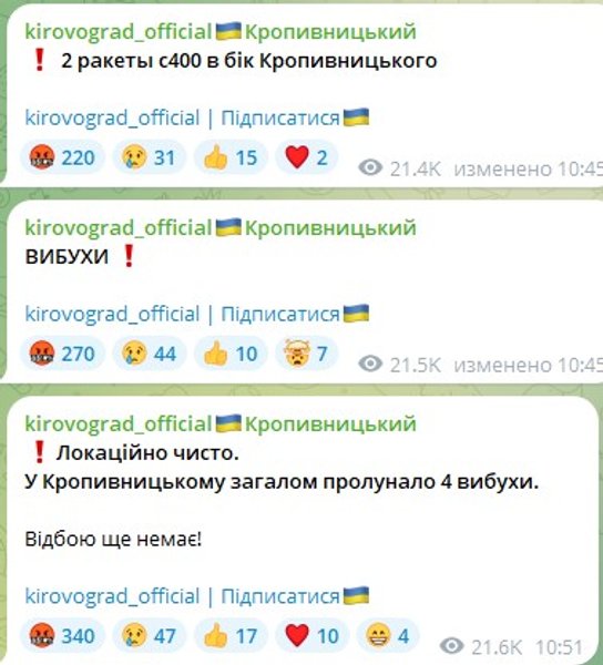 Кореспонденти "Суспільне Новини" з 10:00 до 10:50 повідомляли про вибухи в Кропивницькому та Кривому Розі.