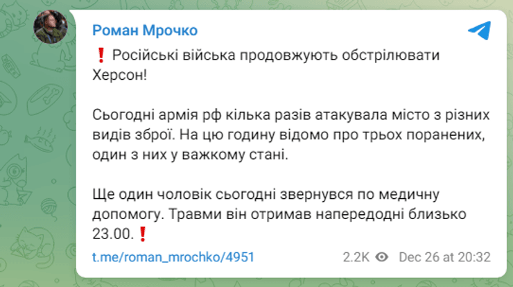 Як повідомив 26 грудня голова Херсонської міської військової адміністрації Роман Мрочко, ЗС РФ близько 15-ї години дня обстріляли центр Херсона. Обстріл вели з лівого берега Дніпра, внаслідок чого поранення отримав 56-річний чоловік. О 17 годині стало відомо, що росіяни провели масований обстріл міста, о 18:27 Мрочко повідомив про потужні вибухи в місті.
