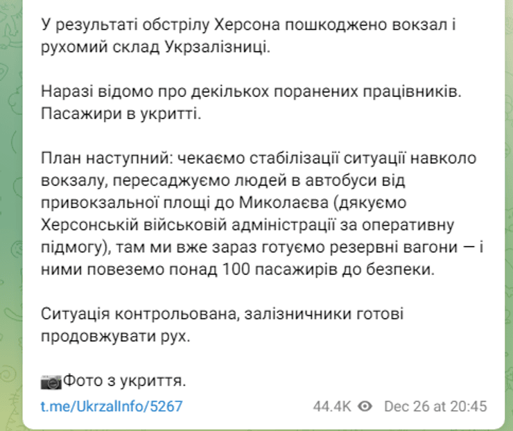 Збройні сили Росії завдали по залізничному вокзалу в Херсоні. Під обстріл потрапив евакуаційний поїзд. Про це у вівторок, 26 грудня, повідомив президент України Володимир Зеленський.