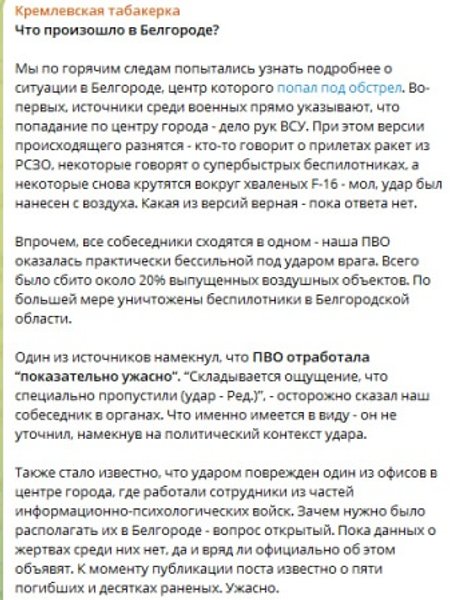 "Наша ППО виявилася практично безсилою під ударом ворога. Усього було збито близько 20% випущених повітряних об'єктів. Більшою мірою знищено безпілотників у Білгородській області. Одне з джерел натякнуло, що ППО відпрацювала "показово жахливо". "Складається відчуття, що спеціально пропустили удар", — переказує слова своїх співрозмовників "Табакерка".