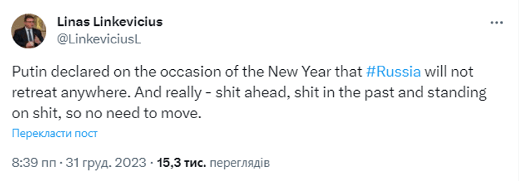 У Литві відреагували на слова Путіна в новорічному зверненні про те, що Росія не збирається нікуди відступати. За словами ексголови МЗС Литви Лінаса Лінкявічюса, РФ і не потрібно нікуди рухатися, адже в них "л*йно попереду, в минулому та під ногами". Про це він написав на своїй сторінці у Х (Twitter).