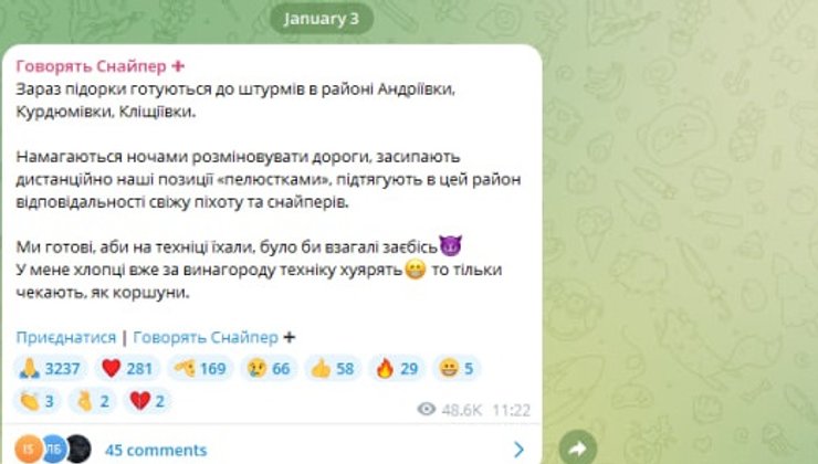 Нагадаємо, що ЗС РФ перегруповуються на Лиманському напрямку і намагаються наступати на місто Часів Яр на Донеччині. Про це 3 січня, повідомив командувач Сухопутних військ ЗСУ Олександр Сирський.