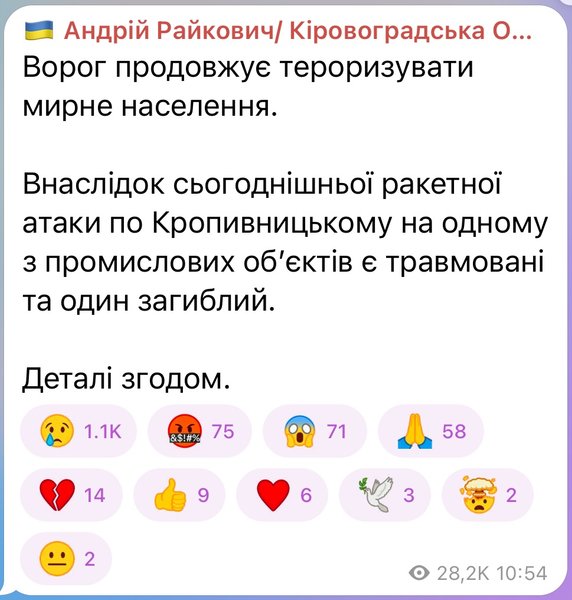 "Ворог продовжує тероризувати мирне населення. Внаслідок сьогоднішньої ракетної атаки по Кропивницькому на одному з промислових об’єктів є травмовані та один загиблий", — йдеться у повідомленні.