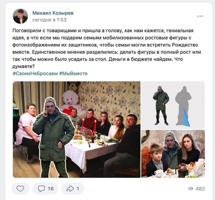 В Росії депутат Вологодської міськдуми Михайло Козирєв вигадав, як зробити так, аби окупанти, які воюють проти України, могли бути присутніми на сімейних застіллях і на фото з родинами. Він запропонував робити їхні зростові фігури з картону. Про це пише видання Baza.