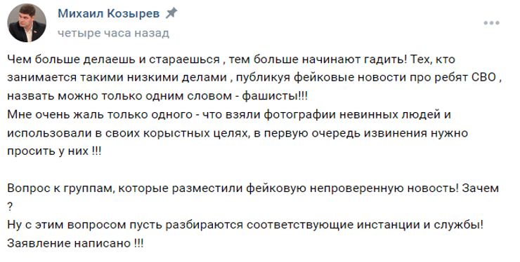 За словами депутата, він написав заяву до поліції і запевняє, що заяву до правоохоронних органів також написали і жінки, фотографії яких використовувалися для посту. Михайло Козирєв припускає, що таке могли влаштувати його конкуренти на тлі майбутніх виборів.