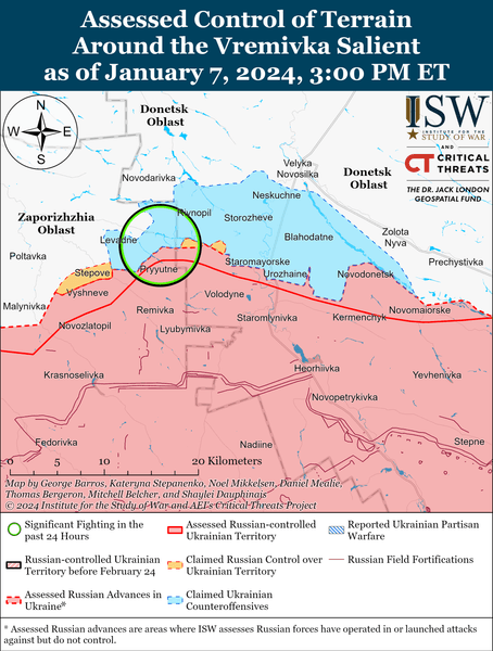 За повідомленнями від 7 січня очільника Авдіївської МВА Віталія Барабаша, на якого покликається ISW, російські війська третій день поспіль вели штурмові дії за всіма напрямками в бік Авдіївки, а поблизу міста окупанти наносять по кілька десятків авіаударів на добу.