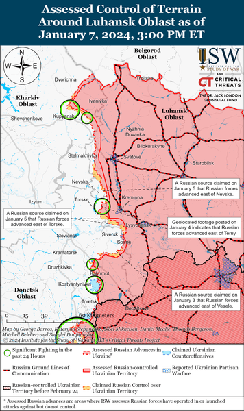 Російські й українські війська продовжили позиційні бойові дії в Харківській і Луганській областях, а на Лівобережжі Херсонщини ЗСУ утримують позиції. Про це повідомляється у зведенні Інституту вивчення війни (ISW) за 7 січня.