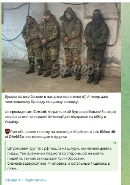 Важливо"Штурмова група з Росії пішла на штурм, їм почали давати п**ди. Тим часом підмога з боку Росії не могла підійти, оскільки закидали FPV і скидами. Спочатку "задвохсотили" 4 людини, а решта 4 здалися в полон", — розповіли про обставини до українського полону сомалійця в телеграм-каналі "Офіцер+".