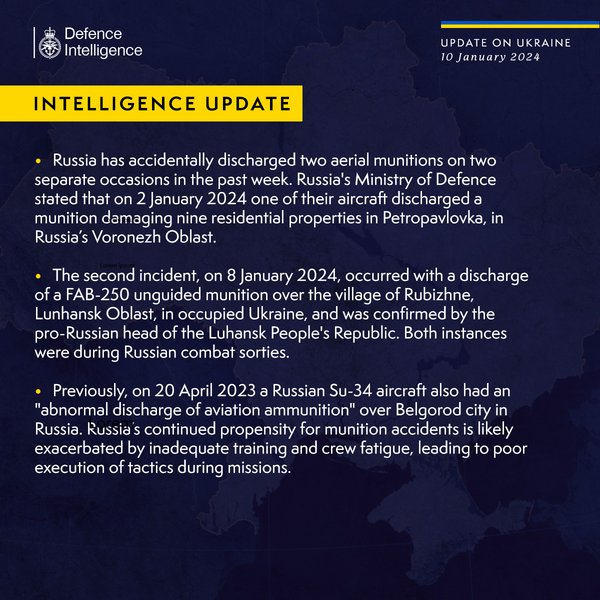 Російські екіпажі бойових літаків виявляють втому і некомпетентність, що стало причиною нештатного сходження авіаційних бомб, які впали на території РФ, а також на тимчасово окупованій території України. Про це 10 січня повідомила пресслужба Міноборони Великої Британії.