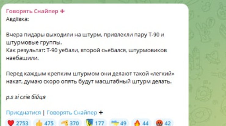 У районі Авдіївки на Донеччині окупанти готуються до масштабного штурму. Про це у своєму телеграм-каналі "Говорять Снайпер" написав боєць 24-ї окремої штурмової бригади "Айдар" Станіслав Бунятов із позивним "Осман" із покликанням на слова неназваного бійця.
