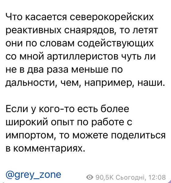 "Що стосується північнокорейських реактивних снарядів, то летять вони, за словами артилеристів, чи не вдвічі менше за дальністю, ніж, наприклад, наші", — запевняє автор каналу.