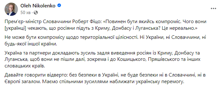 Також на заяву Роберта Фіцо відреагували в Міністерстві закордонних справ України. Очільник міністерства Олег Ніколенко написав, що не може бути ніякого компромісу відносно територіальної цілісності.