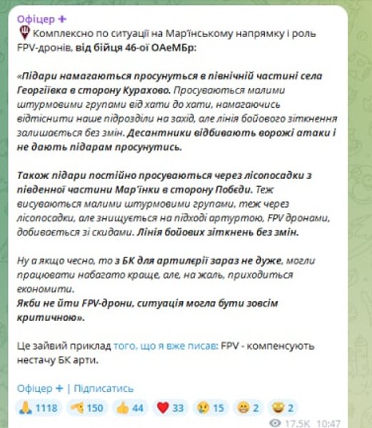 Зазначається також, що росіяни постійно просуваються через лісопосадки з південної частини Мар'їнки в бік селища Перемога. Вони теж висуваються малими штурмовими групами, але знищується на підході артилерією, FPV-дронами та дронами зі скидами.