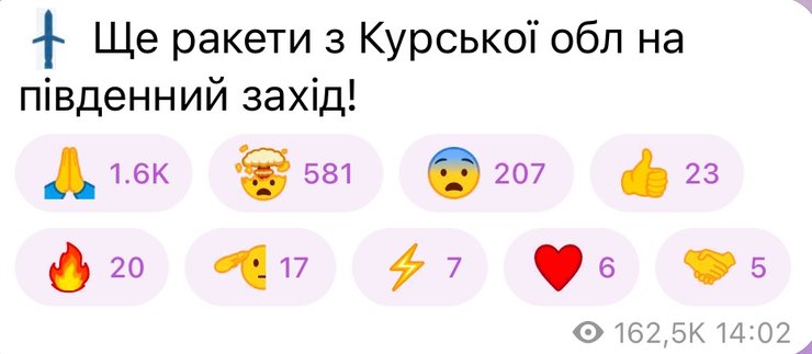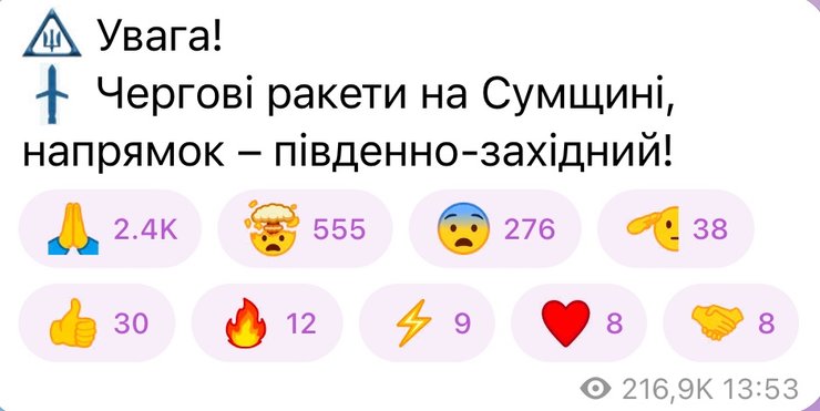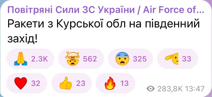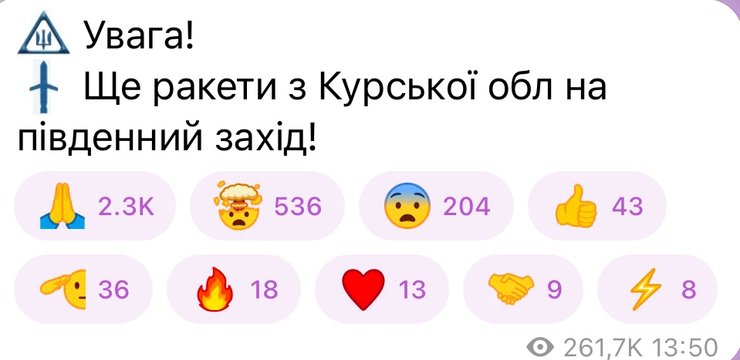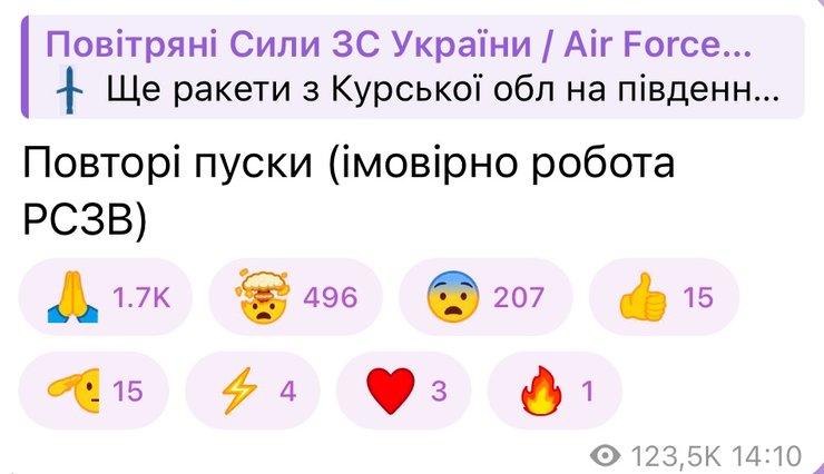 Пізніше, о 14:02, у командуванні додали, що Росія випустила ще ракети з Курської області в напрямку Південного Заходу України.