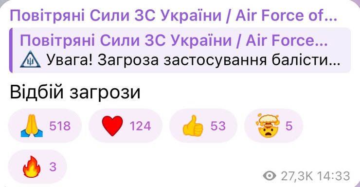Згодом, о 13:50, у командуванні знову попередили про пуски ракети із РФ із таким же напрямком.