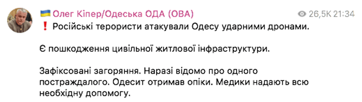 Увечері 24 січня в Одесі після атаки російських дронів і вибуху близько 20:50 почалася пожежа в багатоповерховому житловому будинку в центрі міста. Про це повідомляє у своєму телеграм-каналі голова Одеської ОВА Олег Кіпер.