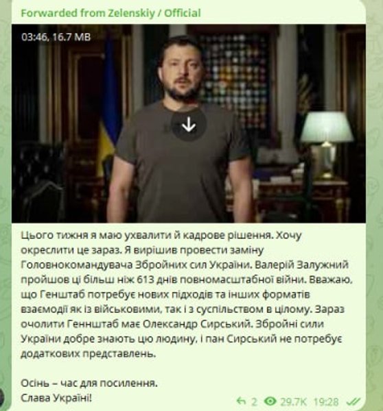 "Цього тижня я маю ухвалити й кадрове рішення. Хочу окреслити це зараз. Я вирішив провести заміну Головнокомандувача Збройних сил України. Валерій Залужний пройшов ці більш ніж 613 днів повномасштабної війни. Вважаю, що Генштаб потребує нових підходів та інших форматів взаємодії як із військовими, так і з суспільством в цілому. Зараз очолити Геннштаб має Олександр Сирський. Збройні сили України добре знають цю людину, і пан Сирський не потребує додаткових представлень", — йдеться в повідомленні приватного телеграм-каналу.