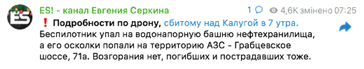 У Калузі про знищення одного українського БПЛА повідомив губернатор Владислав Шапша, а місцевий телеграм-канал "Типовая Калуга", посилаючись на канал Євгена Сьоркіна, уточнив, що безпілотник упав на водонапірну башту, а його уламки потрапили на територію АЗС — Грабцевське шосе, 71а. Загоряння немає, загиблих і постраждалих теж.