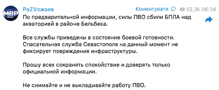 "За попередньою інформацією, сили ППО збили БПЛА над акваторією в районі Бельбека. Усі служби приведені в стан бойової готовності. Рятувальна служба Севастополя наразі не фіксує пошкодження інфраструктури", — пише він.