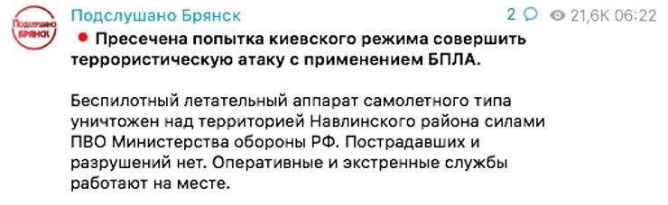 У Брянській області повідомляють про знищення БПЛА над територією Навлинського району.