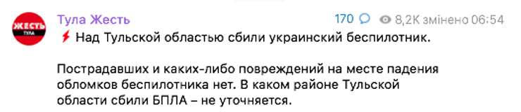 Також підтверджує знищення одного українського БПЛА місцевий телеграм-канал "Тула Жесть".