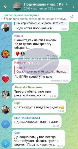 "У Качі тривожно. Імовірно, це той самий вибух, що чули в Сакському районі. Як повідомляє наше джерело, росПВО стріляло по БПЛА", — уточнює канал і публікує листування місцевих жителів.