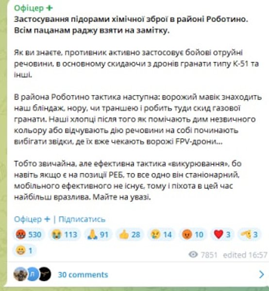 Важливо"Як ви знаєте, противник активно застосовує бойові отруйні речовини, здебільшого скидаючи з дронів гранати типу К-51 та інші. В районі Роботиного тактика наступна: ворожий "мавік" знаходить наш бліндаж, нору, чи траншею і робить туди скид газової гранати. Наші хлопці після того як помічають дим незвичного кольору або відчувають дію речовини на собі, починають вибігати звідти, де їх вже чекають ворожі FPV-дрони", — розповів "Алекс".