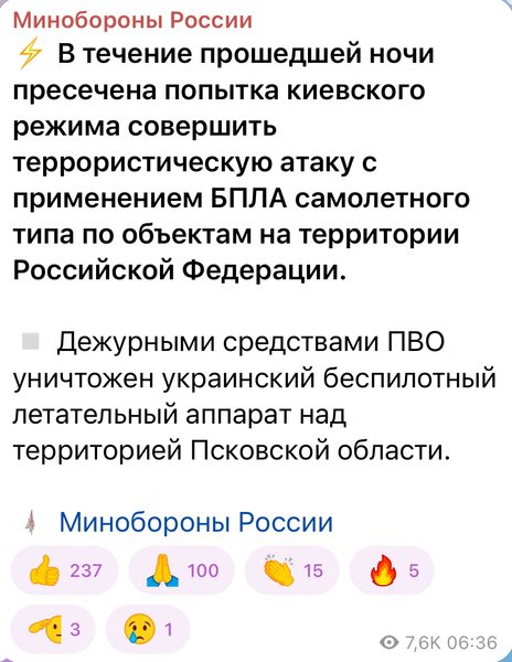 "Черговими засобами ППО знищено український безпілотний літальний апарат над територією Псковської області", — йдеться в повідомленні.