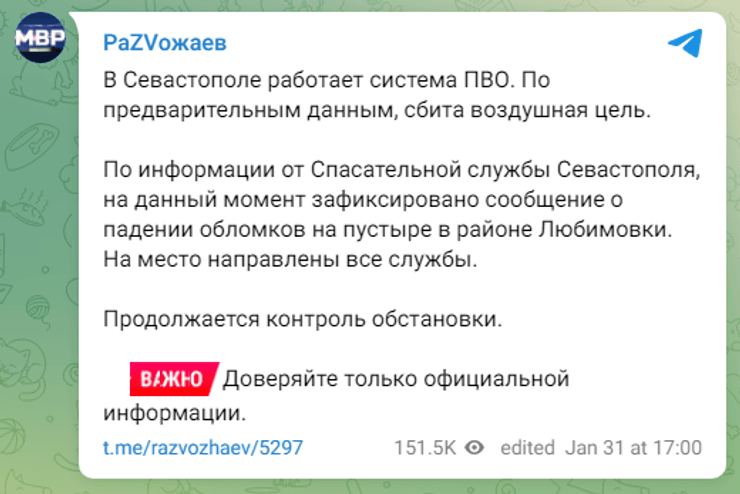 "У Севастополі працює система ППО. За попередніми даними, збито повітряну ціль. За інформацією від "Рятувальної служби Севастополя", наразі зафіксовано повідомлення про падіння уламків на пустирі в районі Любимівки. На місце направлено всі служби", — йдеться в повідомленні окупаційного чиновника.