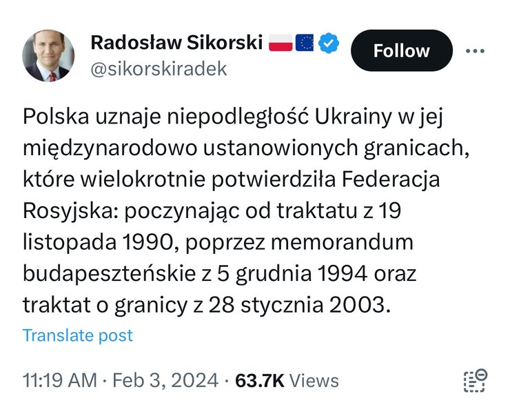 "Польща визнає незалежність України в межах її міжнародно визнаних кордонів, які були неодноразово підтверджені Російською Федерацією: починаючи з Договору від 19 листопада 1990 року, Будапештського меморандуму від 5 грудня 1994 року та Договору про кордон від 28 січня 2003 року", — зазначив Сікорський.