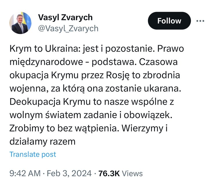 Український посол Василь Зварич в X(Twitter) відреагував на слова польського президента та запевнив, що Україна неодмінно деокупує півострів. Він зауважив, що "Крим — це Україна: так є і так буде".