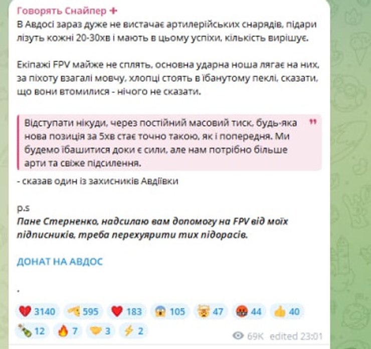 Важливо"Кількість вирішує. Екіпажі FPV майже не сплять, основна ударна ноша лягає на них, за піхоту взагалі мовчу, хлопці стоять в пеклі, сказати, що вони втомилися — нічого не сказати. Відступати нікуди, через постійний масовий тиск, будь-яка нова позиція за 5 хвилин стає точно такою, як і попередня. Ми будемо ї**шитися доки є сили, але нам потрібно більше арти та свіже підсилення", — йдеться в повідомленні.