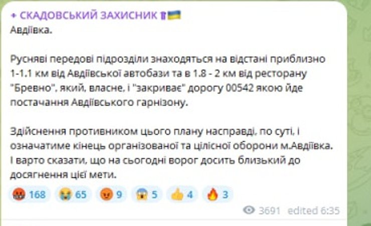 В телеграм-каналі "Скадовський захисник" повідомляють, що підрозділи ЗС РФ перебувають на відстані приблизно 1-1.1 км від Авдіївської автобази та в 1.8 — 2 км від ресторану "Бревно", який, власне, і "закриває" дорогу 00542, якою йде постачання Авдіївського гарнізону.