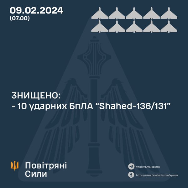 У ніч проти 9 лютого російські окупанти атакували територію України ударними дронами-камікадзе типу Shahed. Вибухи лунали в Миколаївській, Харківській і Херсонській областях. Про роботу ППО розповіли в Повітряних силах України.